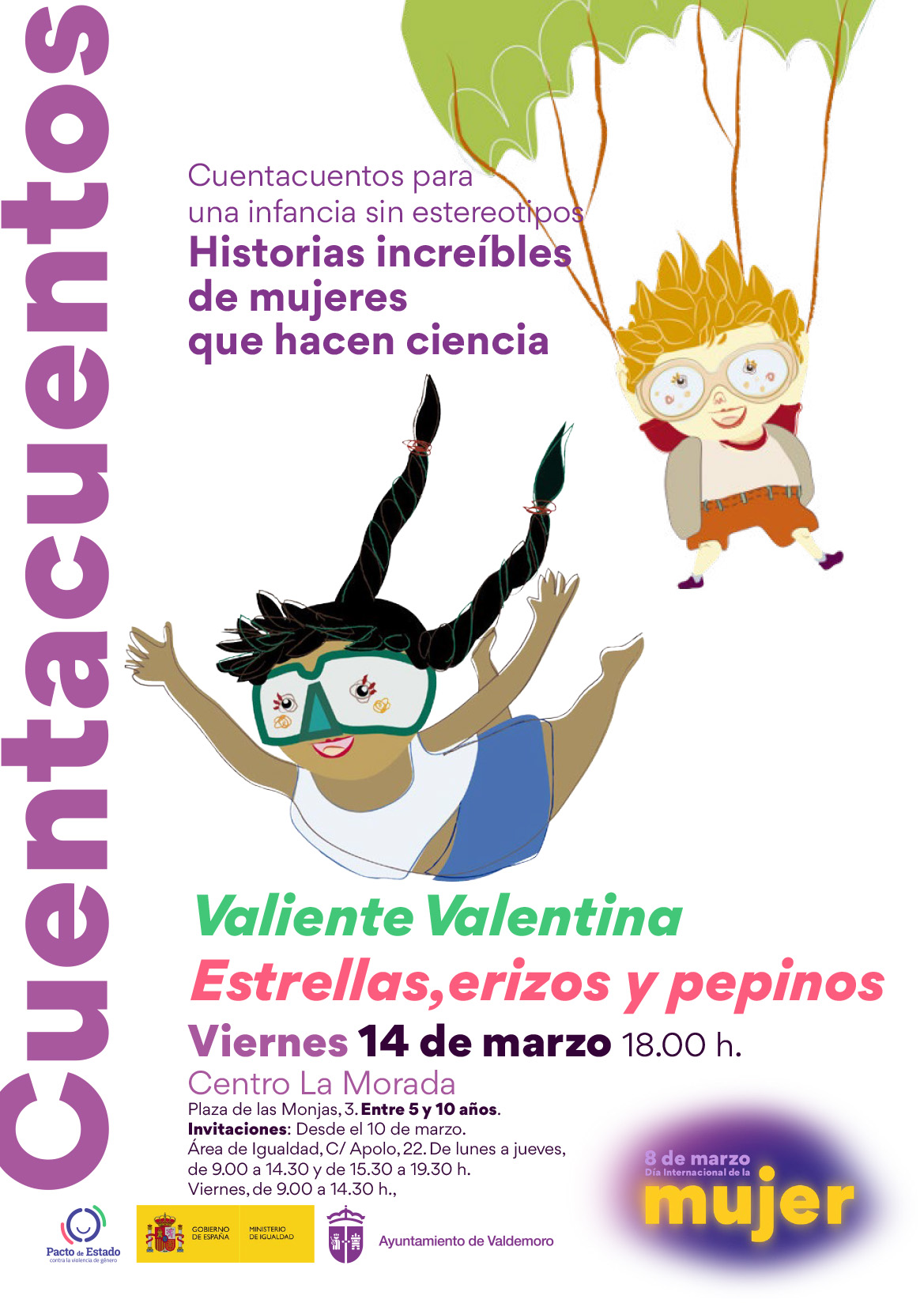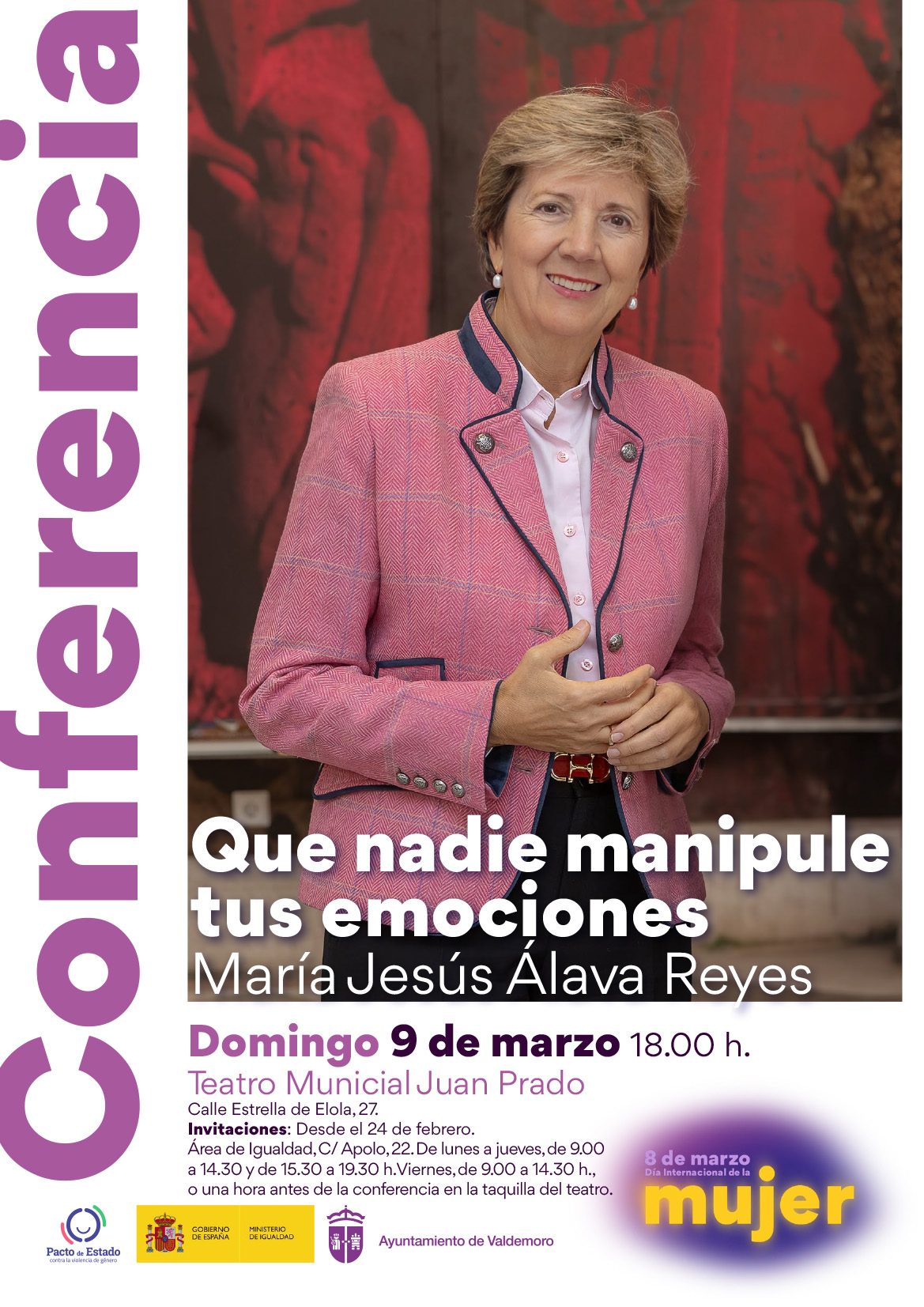 Entrada con invitación. Disponibles desde el lunes 17 de marzo en el Área de Igualdad (C/ Apolo, 22). De lunes a viernes, de 9:30 a 14.30 h. y de lunes a jueves, de 15:30 a 19:30 h.