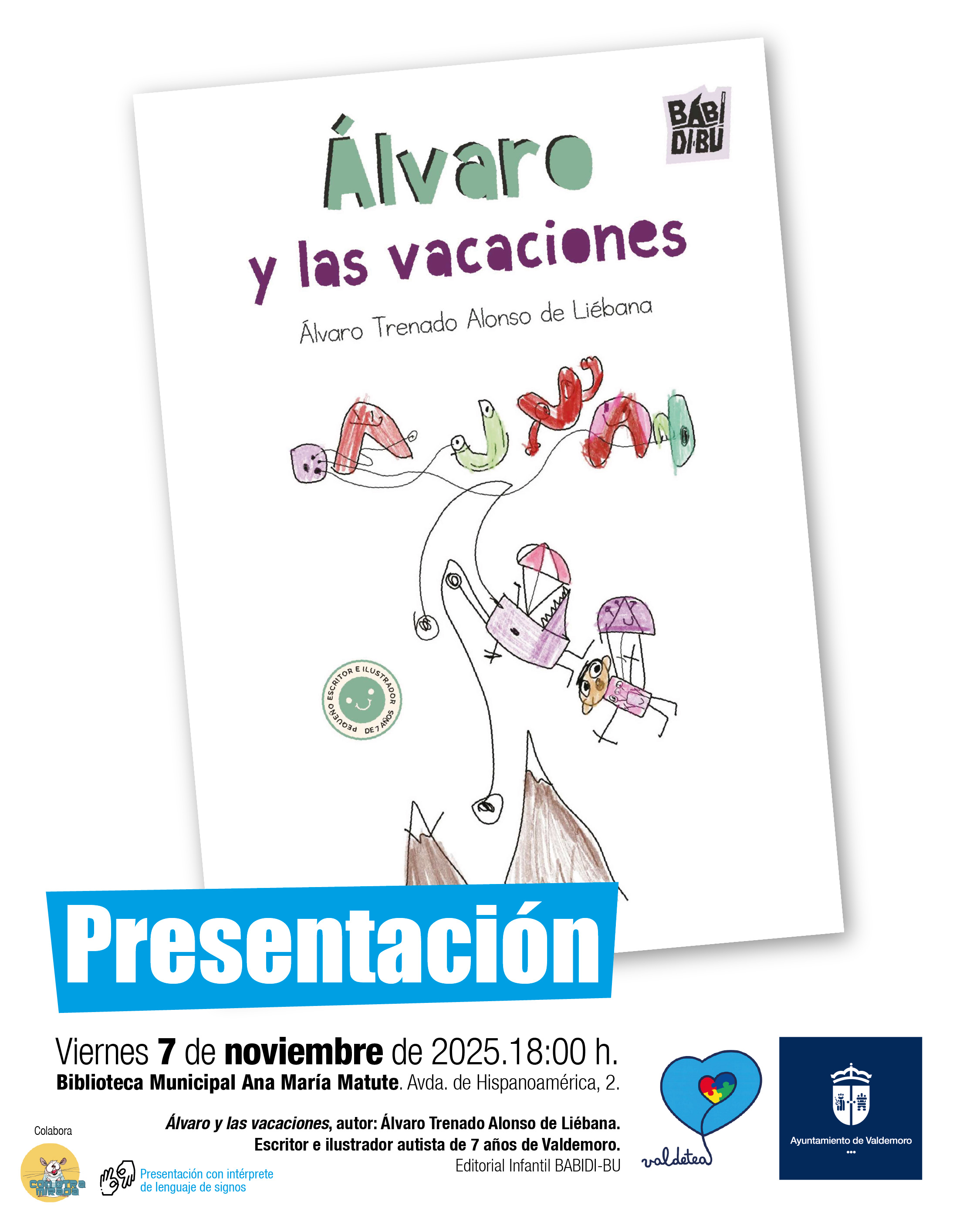 El pequeño escritor e ilustrador valdemoreño Álvaro Trenado Alonso de Liébana (7 años) presentará en la Biblioteca Municipal Ana María Matute su libro Álvaro y las vacaciones, editado por Babidi-bu. La cita será el viernes 7 de octubre, a las 18:00 h, y contará con intérprete en lengua de signos.