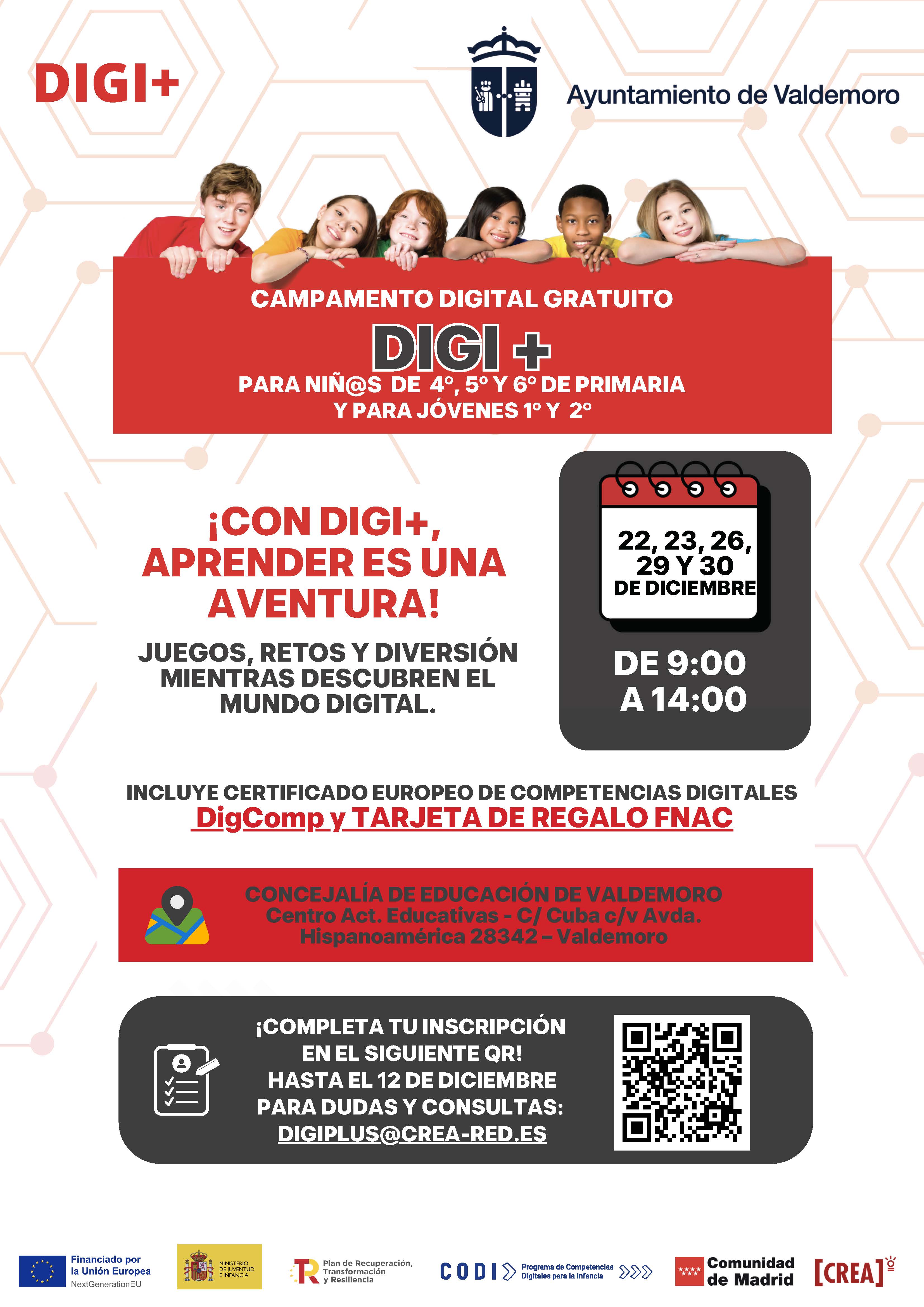 PLAZAS AGOTADAS.- El Centro de Actividades Educativas acoge los días 22, 23, 26, 29 y 30 de diciembre, de 9:00 a 14:00 h. el campamento digital gratuito DIGI+ para niños y niñas de 4.º, 5.º y 6.º de Primaria y jóvenes de 1.º y 2.º de ESO. Para asistir es preciso inscribirse hasta el 12 de diciembre en el siguiente enlace.