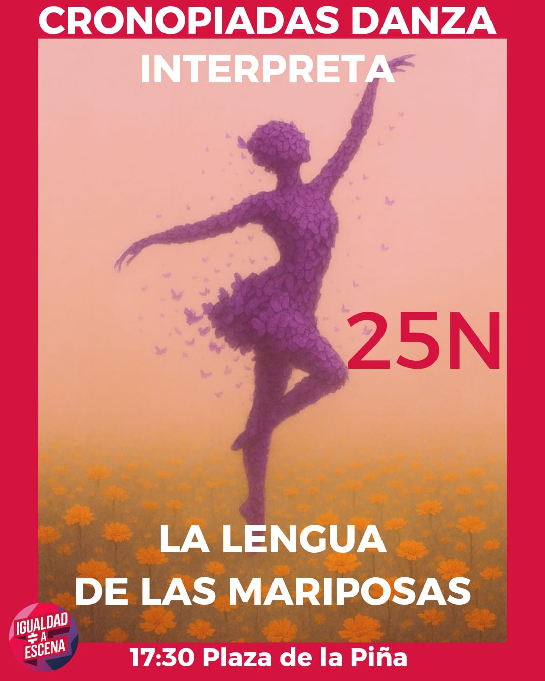 La representacion correrará a cargo de Cronopiadas Danza, el grupo de danza que dirige María José Méndez, que escenificará diferentes piezas con las que el colectivo quiere honrar a todas las mujeres que han sido víctimas de violencia de género, destacando la figura de la mariposa como símbolo del cambio la alegria, la esperanza y los nuevos tiempos, también la necesidad de no guardar silencio. Una oda a la transformación y a la vida, simbólizado en un arte que está en las casas, en las calles, en la vida.