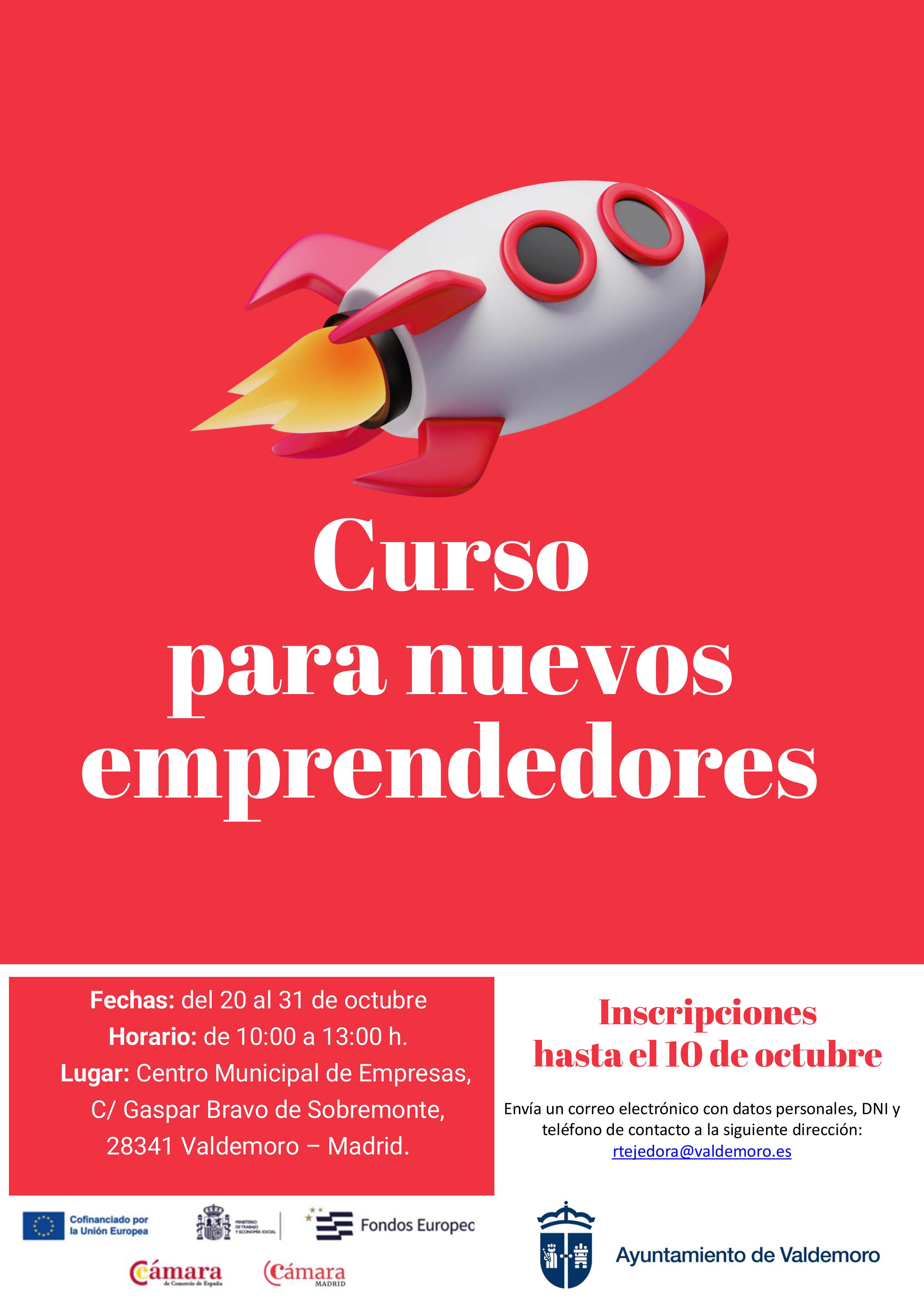El Centro de Empresas abre, hasta el 10 de octubre, el plazo de inscripción del Curso para nuevos emprendedores, que se celebrará en su sede de la calle Gaspar Bravo de Sobremonte entre el 20 y el 31 del mismo mes. Esta formación de la Cámara de Comercio, que cuenta con el respaldo de la Unión Europea, del Ministerio de Trabajo y Economía Social y de los Fondos Europeos, y la colaboración del Ayuntamiento de Valdemoro, está dirigida a aquellas personas que precisen conocimientos básicos que les den la confianza necesaria para poner en marcha sus proyectos empresariales.