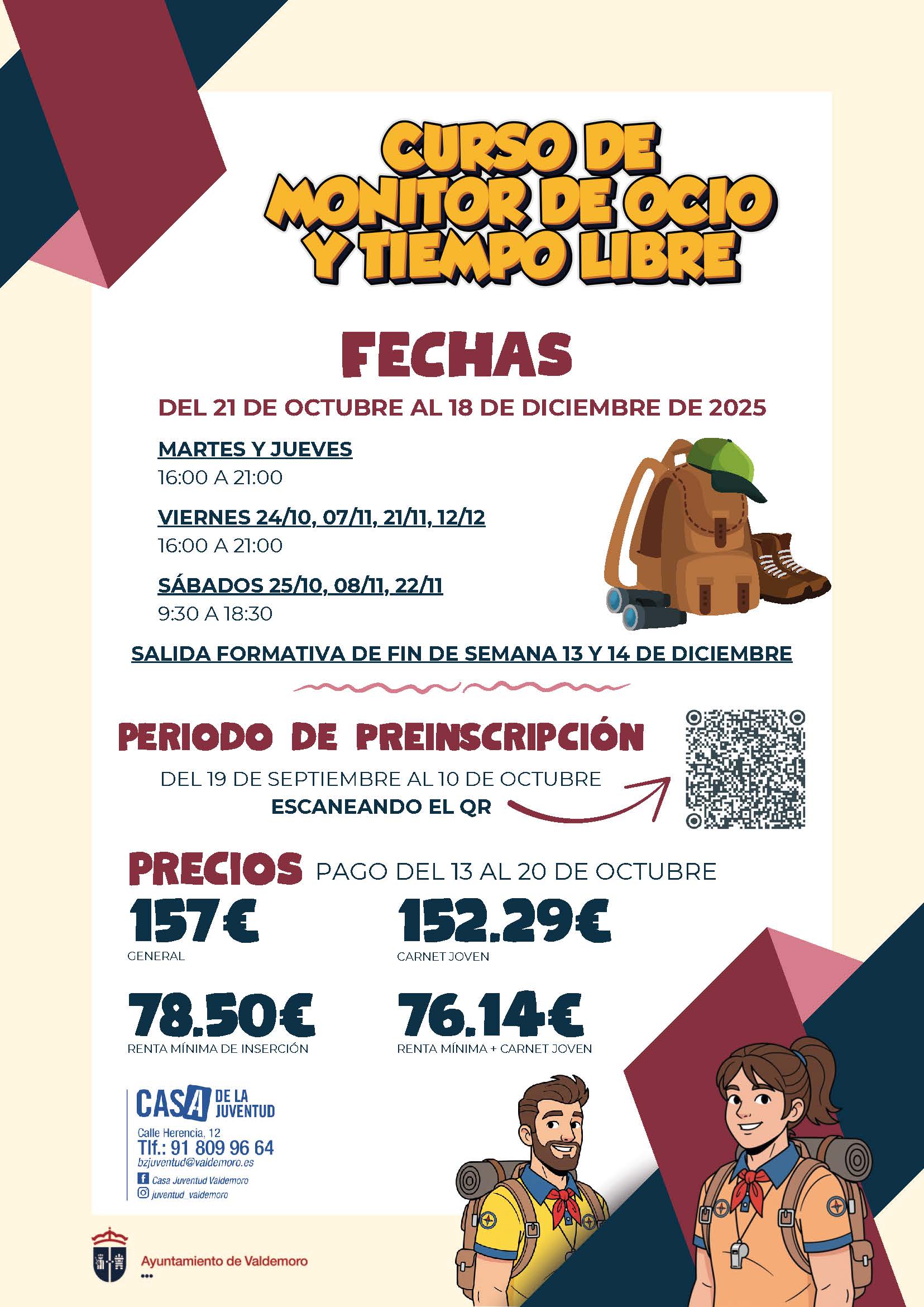 A través de la Casa de la Juventud, el Ayuntamiento ha programado un Curso oficial de monitor de tiempo libre infantil y juvenil que se impartirá del 21 de octubre al 18 de diciembre de 2025. Las inscripciones estarán abiertas hasta el 10 de octubre y los requisitos para participar son tener terminada la Enseñanza Secundaria Obligatoria (ESO) y haber cumplido los 17 años. El precio es de 157 € con descuentos del 50% para los solicitantes en riesgo de exclusión social y de un 3% para titulares del Carné Joven en vigor. Quienes superen la formación obtendrán un diploma oficial de la Comunidad de Madrid.