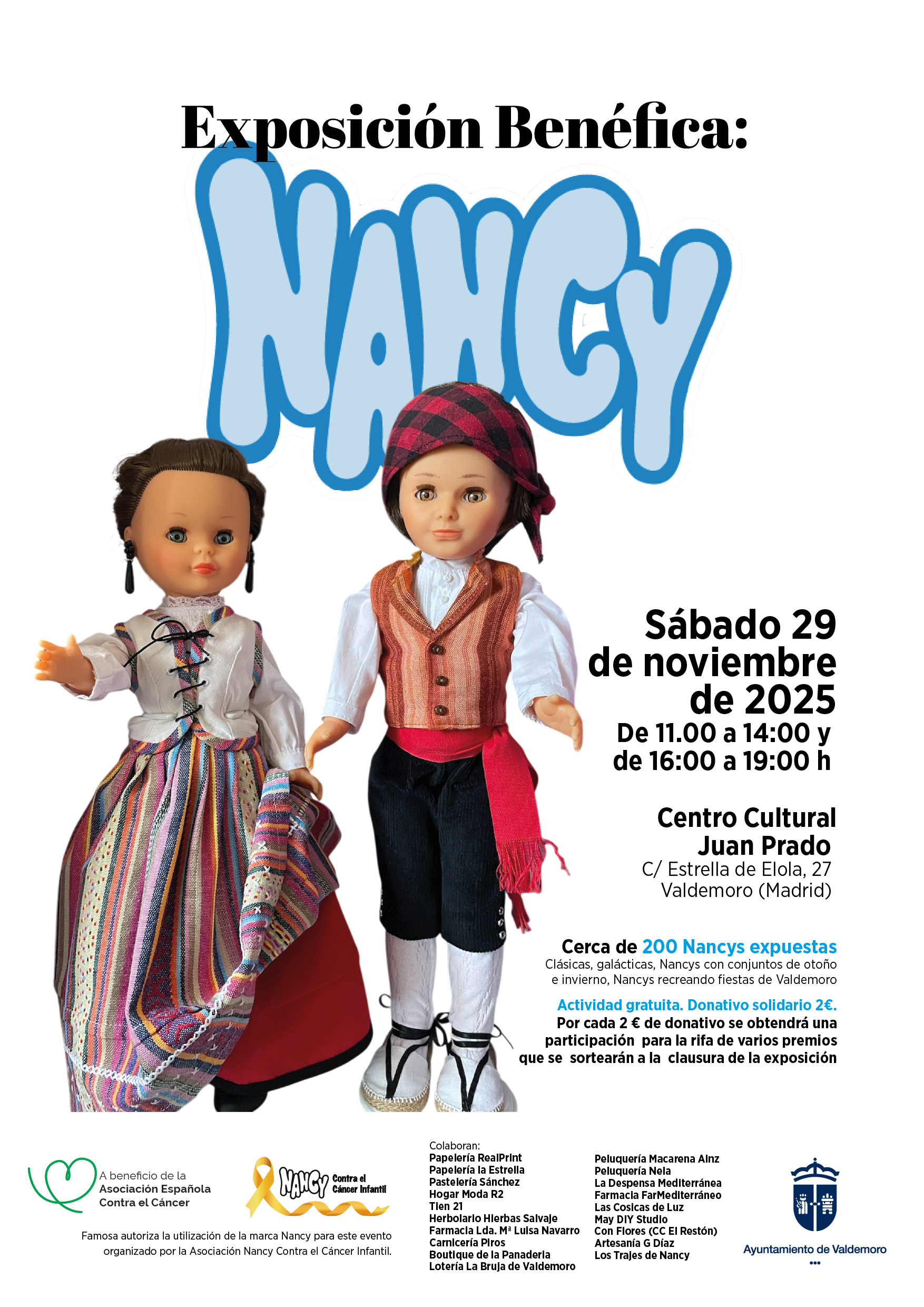 La sala de exposiciones del Centro Cultural Juan Prado acoge, el 29 de noviembre, la exposición benéfica Nancy, dedicada a la histórica y entrañable muñeca de Famosa, en una muestra organizada por la Asociación Nancy Contra el Cáncer Infantil, que cuenta con más de 170 socios y en la que colaboran cerca de una veintena de establecimientos comerciales del municipio.